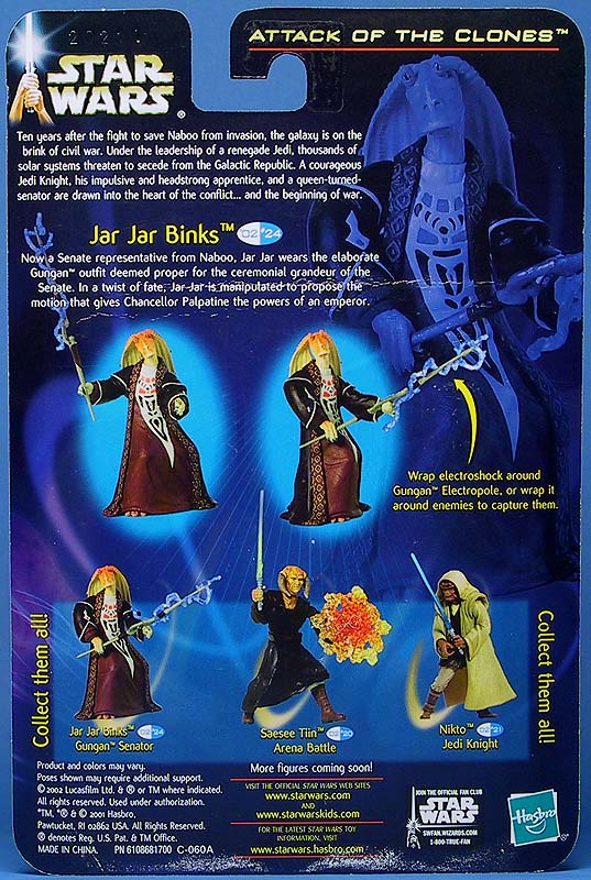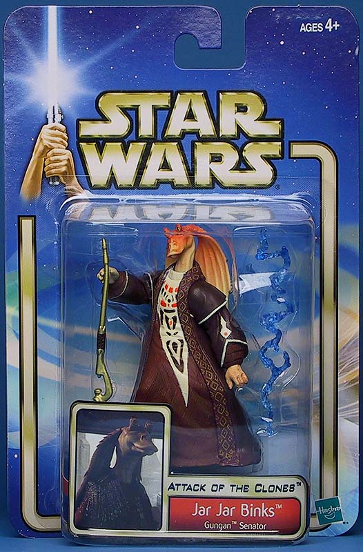 En effet, avec les photos de sa figurine (très belle figurine d'ailleurs), nous pouvons voir qu'il a été manipulé pour faire du sénateur Palpatine un empereur. Ce qui confirme les rumeurs comme quoi Palpatine deviendrait Empereur dans l'Episode II. Jar-Jar n'en sera que plus detesté !!!