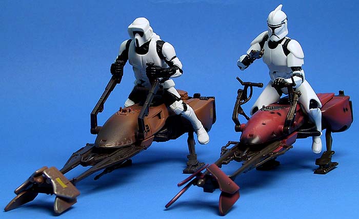 Et la comparaison que tout le monde attendait : un Scout-trooper et un Clone--trooper respectivement sur leurs Speeders ! C'est ici