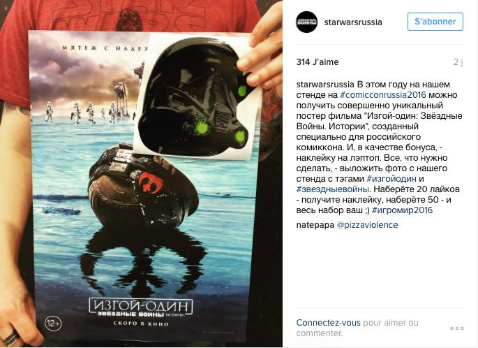 Les visiteurs du Comic-Con de Moscou ont chacun eu la chance de repartir avec un exemplaire de la nouvelle affiche russe de Rogue One ainsi qu'un sticker pour ordinateur représentant un casque de Deathtrooper. Sur cette affiche, nous pouvons y voir le casque d'un soldat rebelle, échoué sur la plage dont le reflet forme le symbole de l'alliance rebelle, avec en arrière plan des Stormtroopers ainsi que des AT-AT.